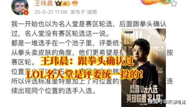 王炜晨作为国内体育圈的大佬之一,他也很关注国内电竞圈的发展。他在看到很多网友关心明年第三位入选LOL名人堂的人选是谁的这个话题后,专门跑去跟LOL官方确认了一下,原来名人堂并不是按照LCK、LPL这些赛区来进行选人的,而是有一众选手池,通过评委来角逐出一位。