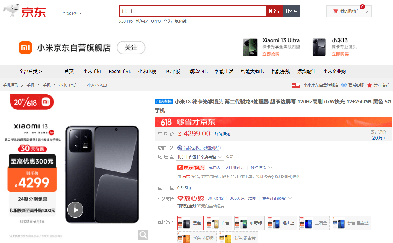 小米13则成为京东618手机竞速排行榜现货单品销量累计榜第六,搭载第二代骁龙8,配合UFS 4.0和LPDDR5X,采用超大VC液冷,内置4500mAh大电池,支持67W有线W无线W无线反充,日常生活使用毫无压力。小米13采用6.36英寸定制超窄视觉四等边柔性直屏,观看清晰且舒适。小米13后置三颗徕卡专业镜头,5000万像素徕卡专业光学镜头,搭配索尼IMX800、HyperOIS超级光学防抖,还有徕卡长焦镜头,拥有75mm焦段,人像拍摄更好,120°超广角镜头,容纳更广阔视野。小米13 12GB+256GB版京东618可享至高优惠300元,京东价4299元,可享24期免息、30天价保、以旧换新至高补贴1000元。