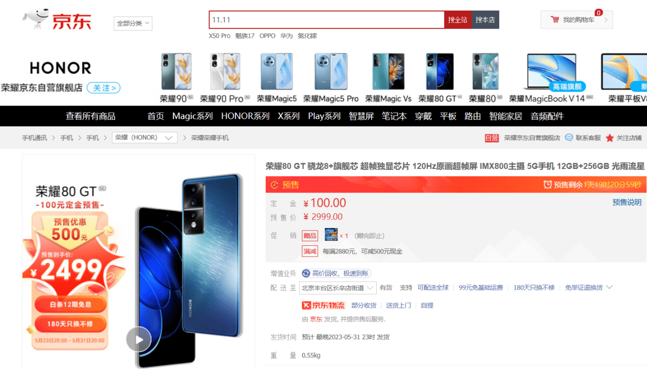 荣耀80 GT京东618手机竞速排行榜预售单品销量累计榜第五,其搭载第一代骁龙8+和一颗超帧独显芯片,电竞帧率更高的同时功耗更低,兼顾高性能与高能效。荣耀80 GT搭载120Hz直屏,支持视频画质增强、2160Hz高频PWM调光技术、类自然光护眼功能,观看清晰流畅还护眼。荣耀80 GT在影像方面搭载IMX800主摄,5400万超清像素、1/1.49英寸超大底传感器,光线捕捉能力更强,还搭载HONOR Image Engine计算影像平台,拍照实力更出众。荣耀80 GT 12GB+256GB版京东618预售优惠500元,付100元定金,预售到手价2499元,可享12期免息、180天只换不修。