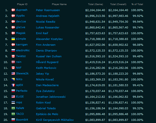除此之外,魔男Magisk在CS:GO奖金榜中成功超越选手s1mple,回归奖金榜TOP5名单。值得一提的是,前五名选手正是A队王朝五人组。