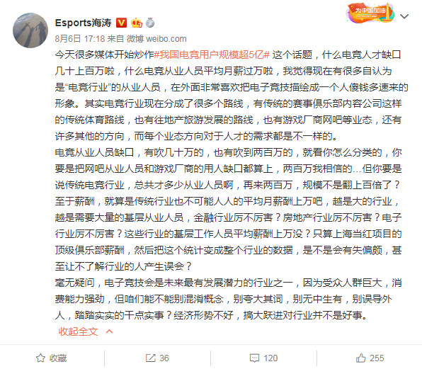 最近,老牌电竞从业者,imbaTV的创始人,著名DOTA2解说海涛就电子竞技行业的事情发表了一则微博。微博中海涛痛斥了一些无良媒体不切实际的吹捧电子竞技。并且海涛还表示,电子竞技目前只有金字塔顶端的一部分人是高薪,这部分人大多是职业选手和解说还有一些俱乐部经理。而大部分人还并非媒体所报道的高薪行业。
