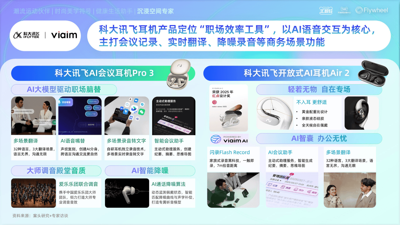 科大讯飞耳机以“职场效率工具”为精准定位,将AI语音交互技术深度融入商务办公场景。旗舰产品AI会议耳机Pro 3基于viaim AI大模型,集成声纹复刻、多场景翻译与智能会议纪要功能,成为高效的“职场脑替”;而开放式AI耳机Air 2则主打轻量化设计与全天候舒适佩戴,兼顾通话质量与移动办公需求。这一产品策略彰显出商务耳机正向集智能翻译、语音交互与生产力工具于一体的效率伙伴加速演进。