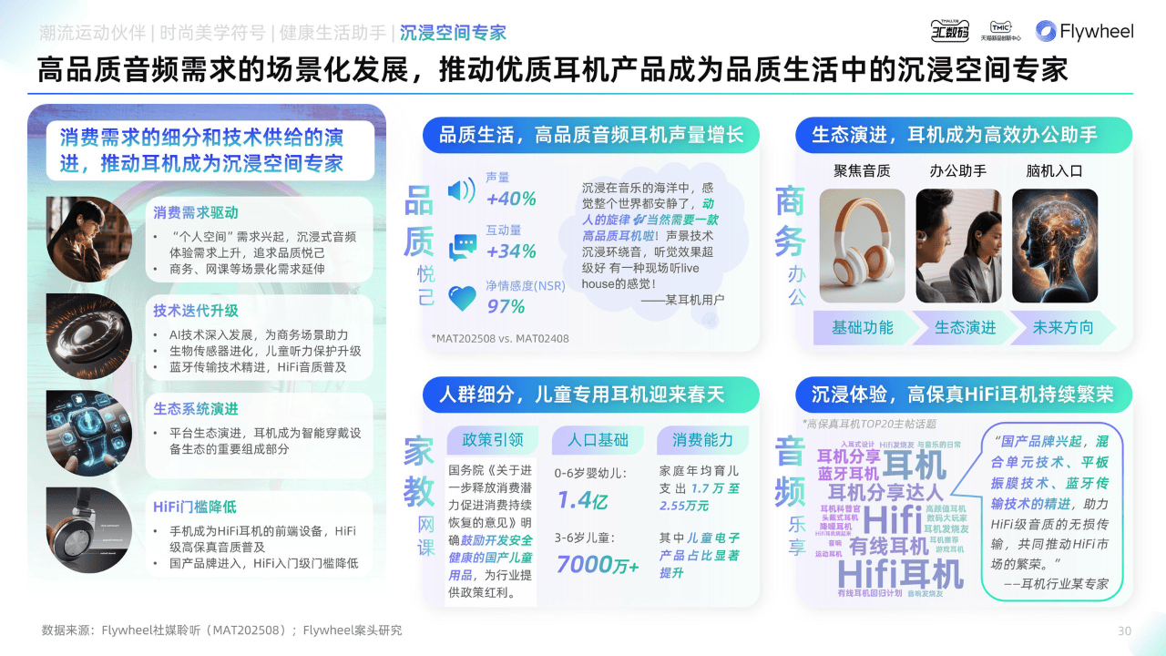 在这一趋势中,高品质音频需求推动耳机升级为构建个人沉浸空间的“专家型”工具,通过场景化创新持续拓展其价值边界。消费端对个人空间与品质悦己的追求持续升温,带动相关声量显著增长;技术端则借助AI算法、生物传感与蓝牙传输的进步,为商务降噪、儿童听力保护及高保真音质普及提供了坚实支撑。与此同时,耳机在生态中的角色不断深化,更随着HiFi门槛降低而进一步融入大众的高品质生活。