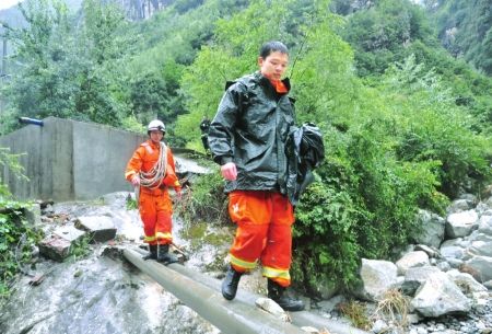 经过观察,消防官兵发现,洪水水流湍急,他们根本无法直接沿着国道前往桥梁下方。后经研究这才确定救援方案:翻山绕行前往救援。于是,在当地居民引领下,消防官兵携带救援器材,翻过一座山,小心翼翼地穿过用电线杆架设的人行桥,终于来到了桥梁另一头的路段上。