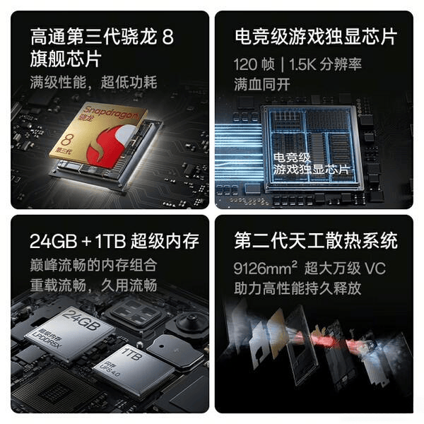 第三代骁龙8移动平台:搭载第三代骁龙8处理器,结合4nm工艺,使性能提升30%,同时能效也提升了25%。Adreno 750 GPU的提升让游戏画面更加流畅,LPDDR5X和UFS 4.0的配置确保了快速的多任务处理和存储速度,使用起来畅快无比。