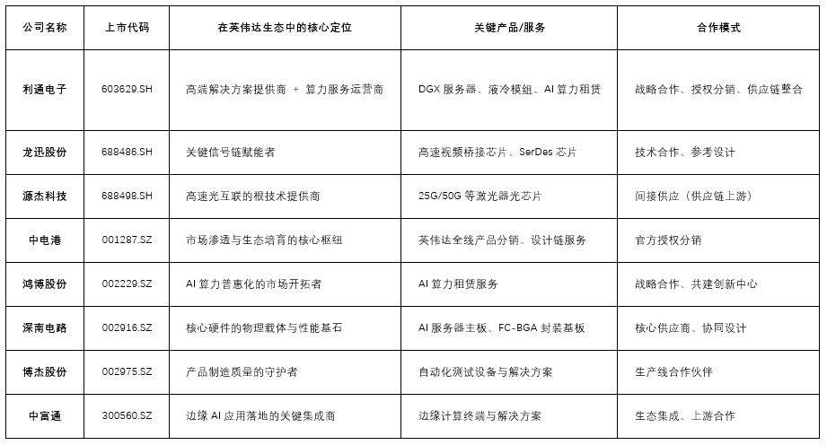 这八家公司——利通电子、龙迅股份、源杰科技、中电港、鸿博股份、深南电路、博杰股份、中富通——并非英伟达的子公司,而是通过在供应链、分销渠道、技术合作、服务应用等不同环节与英伟达建立的紧密联系,深度融入其价值链,并成为分享AI时代红利的关键参与者。它们各自在产业链中扮演着不可或缺的角色,从上游核心元器件供应,到中游的生产制造与测试,再到下游的系统分销与算力服务,共同构成了一幅英伟达在中国业务拓展的全景图。
