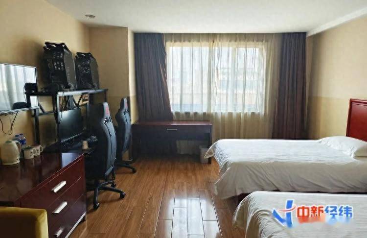 中新经纬走访时看到,格林豪泰联盟酒店10层的房间门口都标有“电竞主题房”的字样,酒店走廊有电竞相关的海报装饰;一间电竞双人房内有两台电脑及配套外设,如电竞椅、耳机等,其余设施与正常房间相同。格林豪泰前台工作人员介绍道,电竞房内的电脑配置均一致。