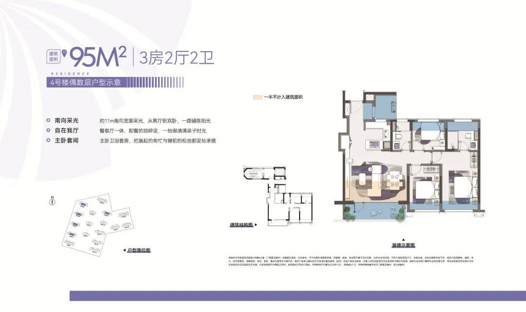 约11米南向全景尺度面宽,约5.4米开间+约23㎡一体化大横厅+南向墅级露台空间,南向主卧套房,开间约3.2米,生活品质直接拉满;配备半开放式方太科技餐厨,独立家政空间,以及超20㎡+的拓展空间,高实得率让“小预算也能享受大空间”。