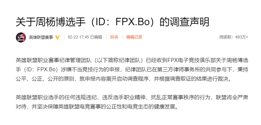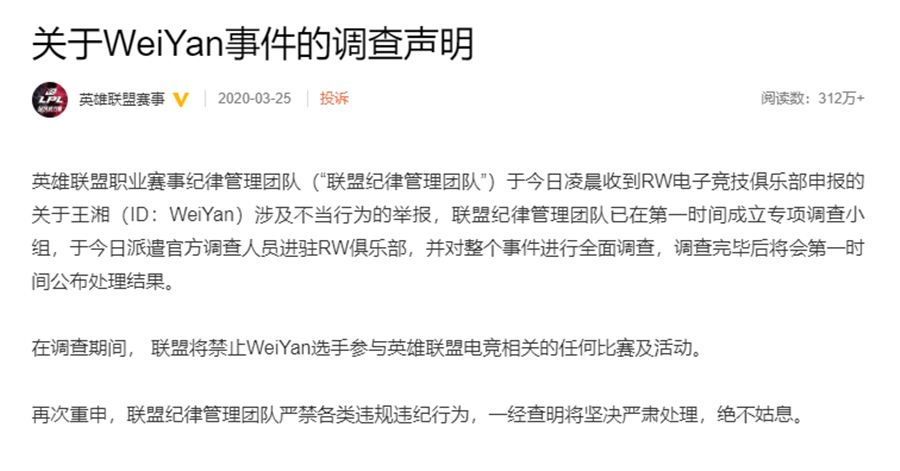 并向LPL官方申报了WeiYan涉及不当行为。后续LPL赛事官方成立专项调查小组,并进驻RW俱乐部对事件进行全面调查。
