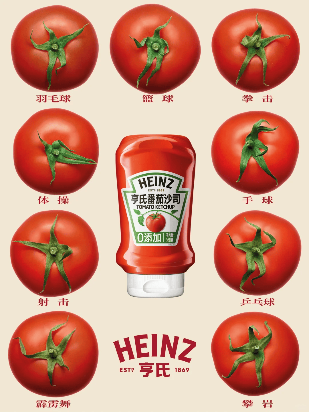 它借全运会热度,推出“运动的番茄”系列创意广告,采用非赞助式借势策略,将番茄叶片设计成34种运动姿态,配合“想赢的番茄在亨氏里”的文案,在地铁、电梯等场景低调亮相。