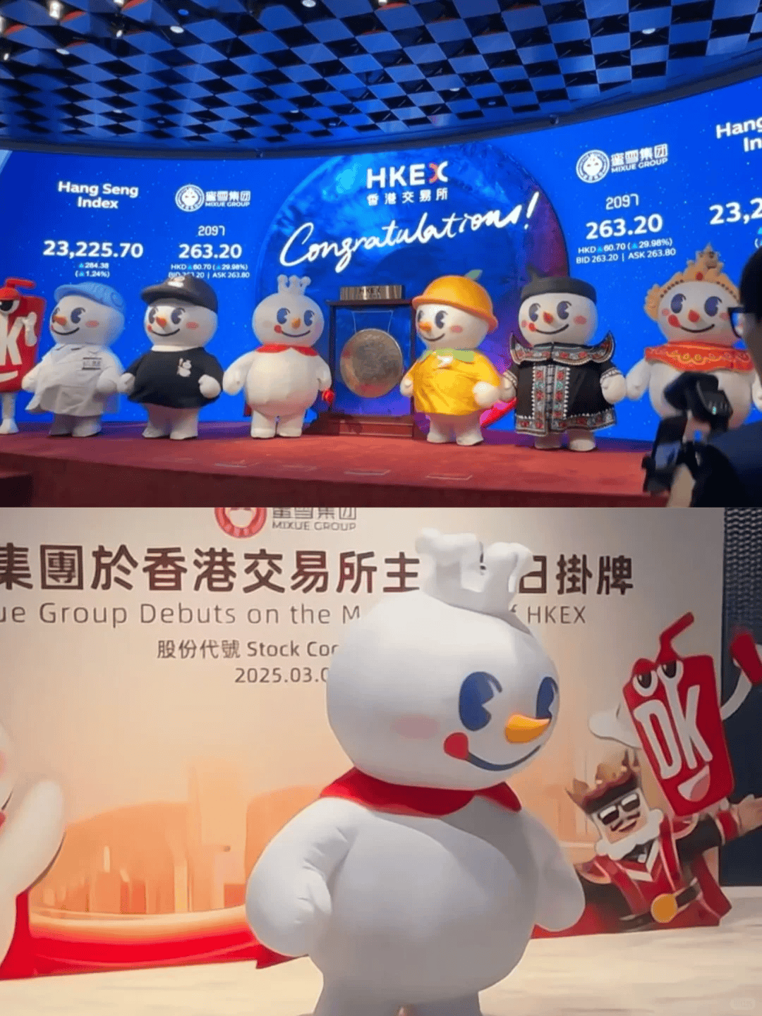 这需要品牌不只是露出一个形象,而是真正构建起有人设、有故事、有情感的角色感,以品牌自有IP为核心,结合战略节点或创意互动,深化IP人格化属性,拉近与用户距离,提升品牌粘性。譬如蜜雪冰城,将港股上市这一严肃的金融事件,巧妙转化为一场“雪王敲钟”的公关秀——那个亲切的雪王形象亲自现身敲钟仪式,并同步直播,配合限定周边和主题活动,让一场商业大事变成了国民级的亲切互动,